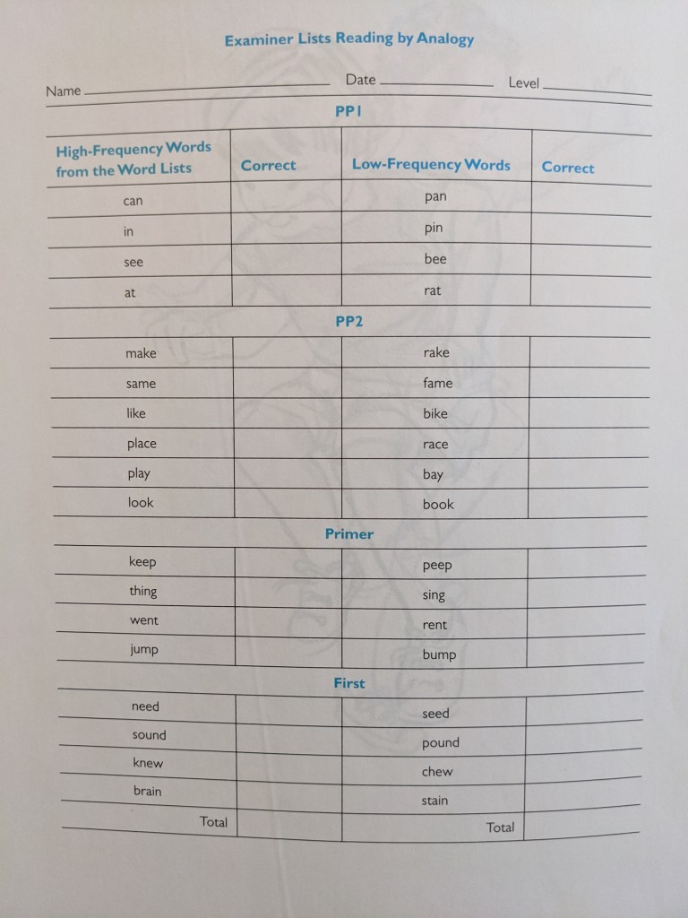 The QRI-6 reading by analogy word list has been included below. Teachers can have students read all four levels or just read the words on the portion of the list that matches their reading level. If students are not able to read the high-frequency words at any given level, do not administer the low-frequency words.